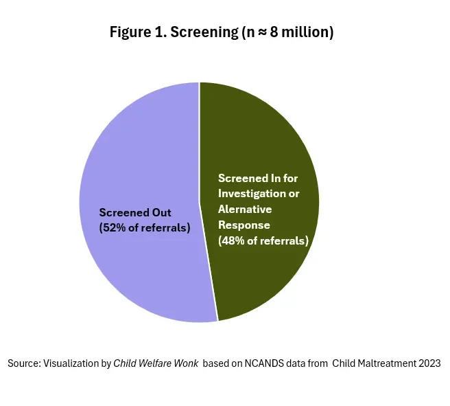 Of these, about 3 million (48 percent) were “screened in,” which means they received either an investigation or an alternative response. The rest were screened out.
