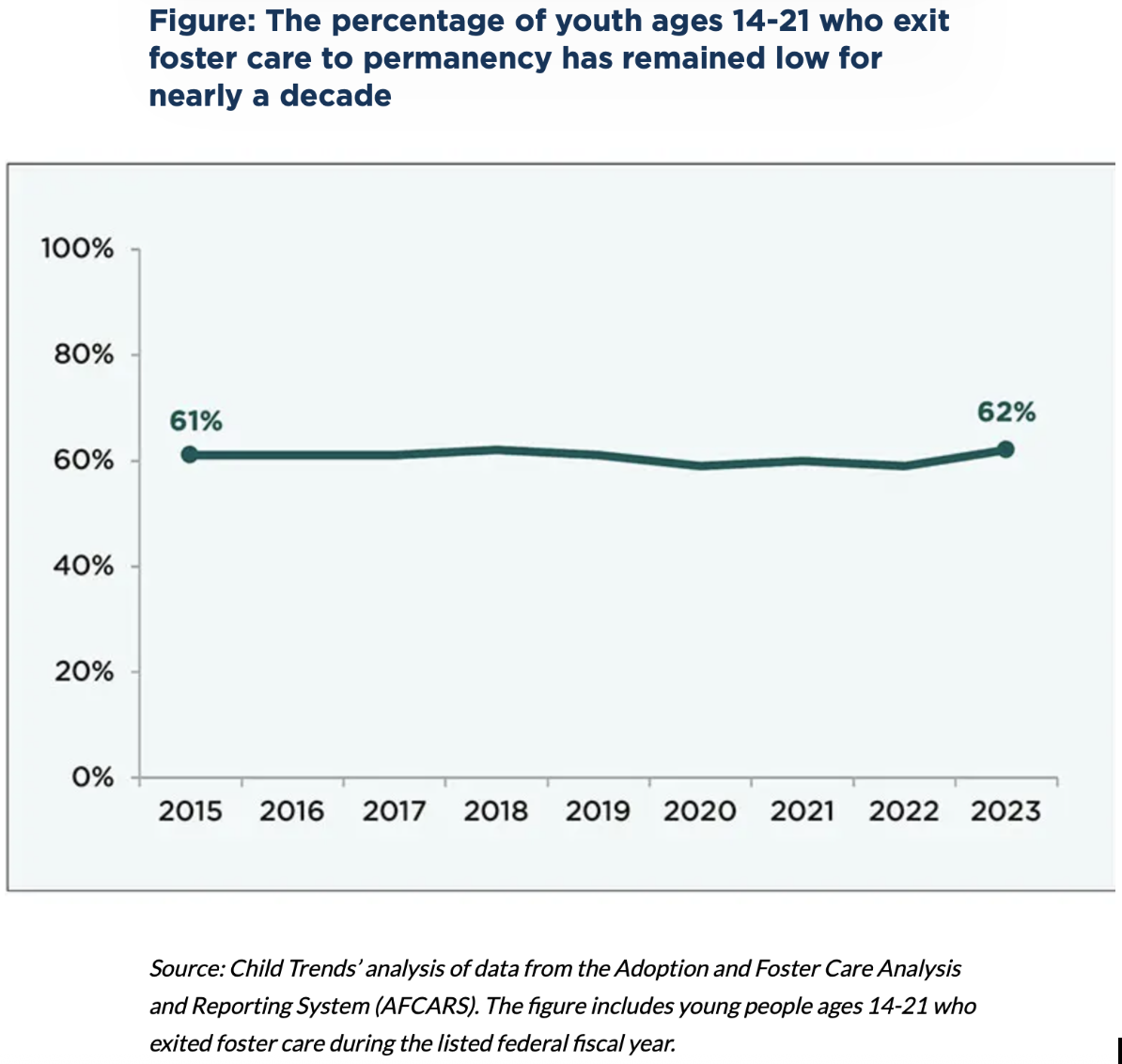 Permanency, including long-term relationships. A repeated theme at the most recent hearing was the benefit for foster youth of lifelong connections with caring adults, and the way the current federal role in supporting them is thin. Analysis by ChildTrends has shown permanency for youth 14-21 steady at just over 60% from 2015 to 2023.