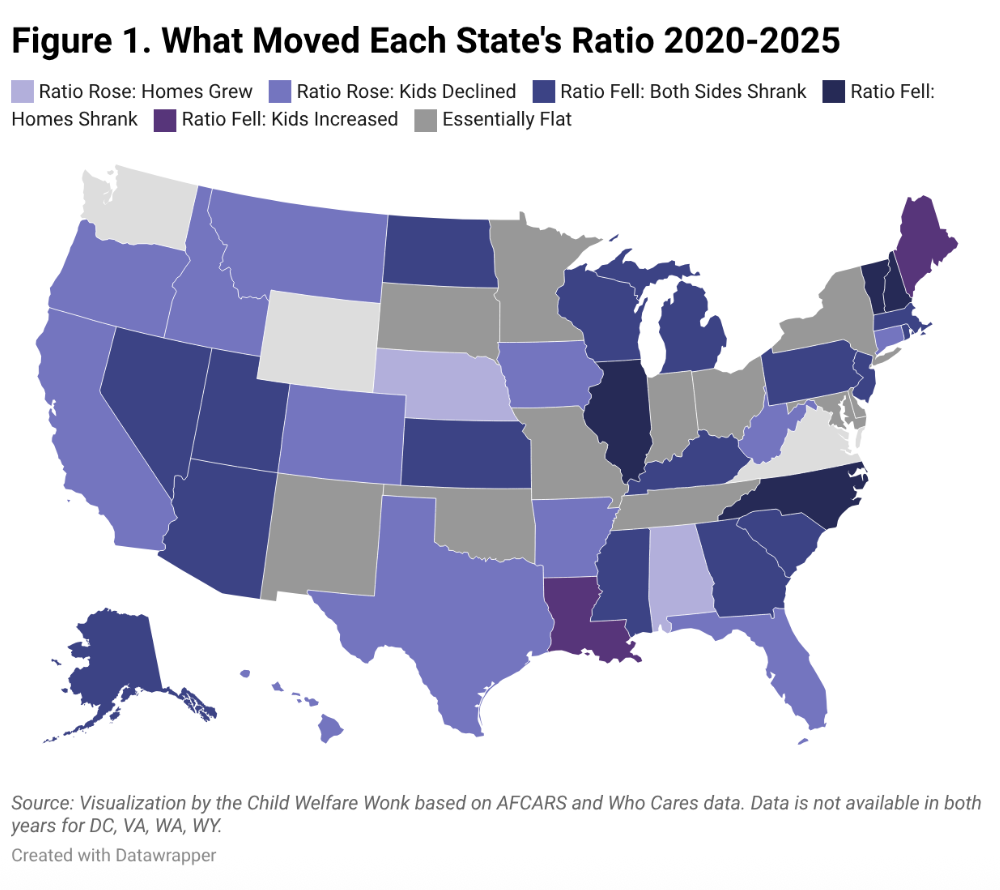 In 11 states, the ratio moved less than 0.05 in either direction between 2020 and 2025. That stability can obscure significant underlying movement. Indiana, for example, lost 1,871 foster homes and saw