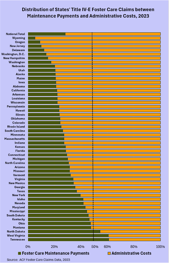 By 2023, foster care maintenance payments represented more than half of total IV-E foster care claims in only three states (Figure 1).